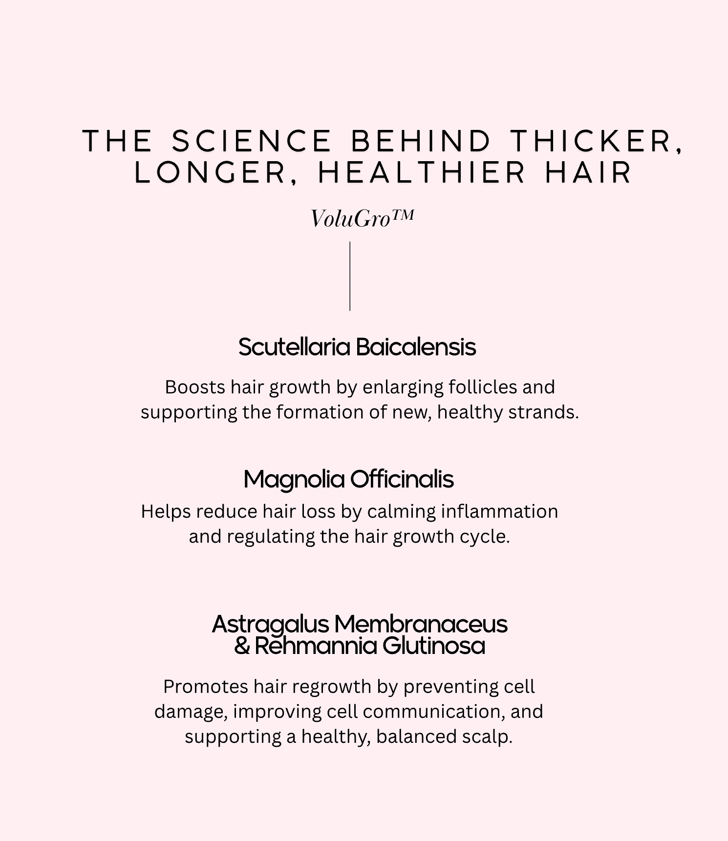 By supporting scalp health and follicle function, VoluGro™ lays a stronger foundation for hair that appears fuller, thicker and longer.